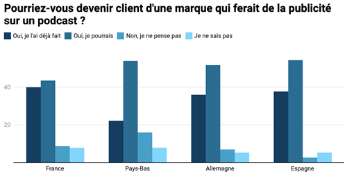 - 40% des Français ayant déjà acheté quelque chose suite à une pub entendue sur un podcast. C’est le pays où ce nombre est le plus élevé. Après l’Espagne, c’est en France que les entreprises sont les plus susceptibles d’investir dans la publicité pendant des podcasts.