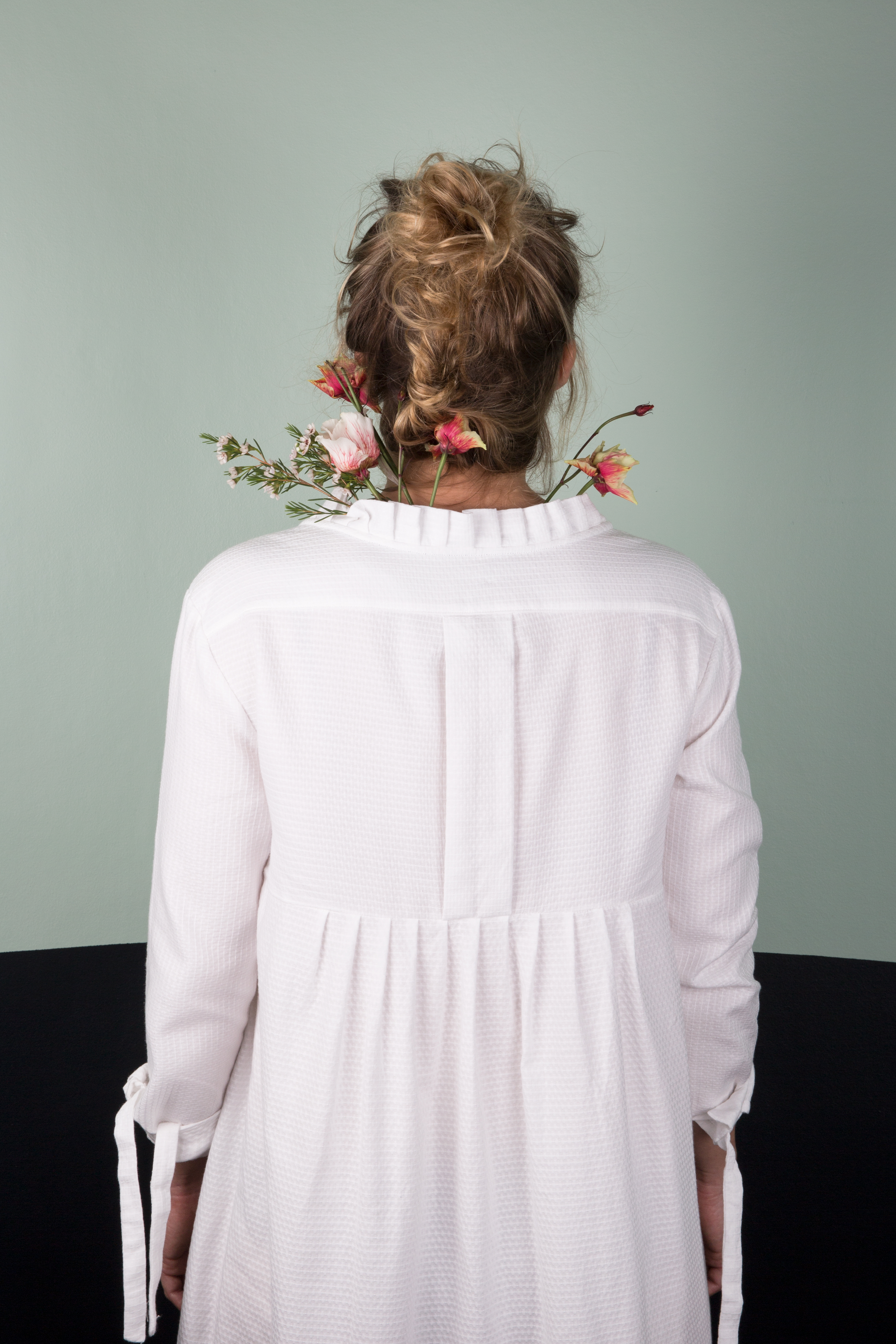 Tous les vêtements sont travaillés avec des coutures anglaises, ce qui apporte à la pièce élégance et longévité. Les plissés sont entièrement réalisés à la main.