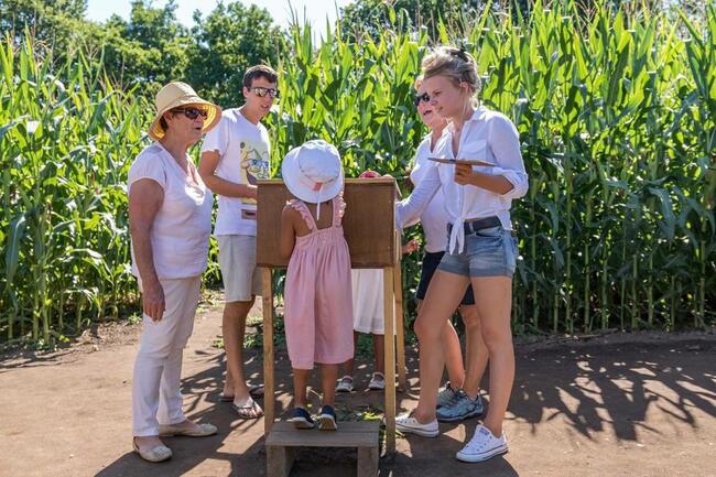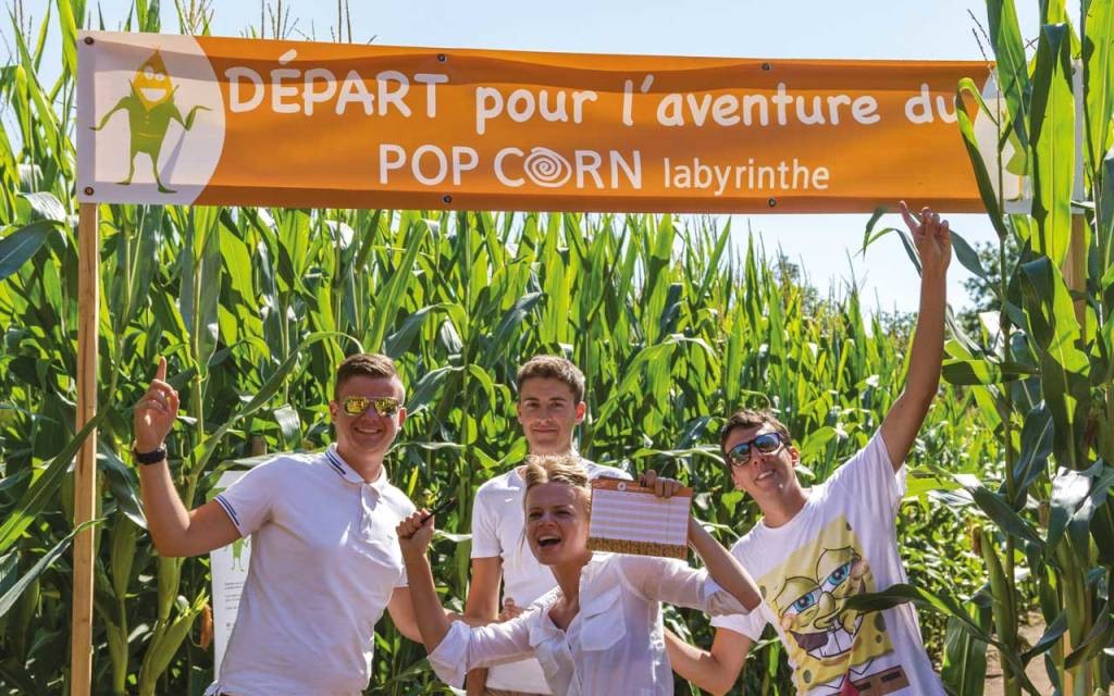 Chaque été, grâce à Pop Corn Labyrinthe, des champs de maïs d’une superficie de 4 hectares environ se transforment en formidables terrains de jeu : des labyrinthes, agrémentés d’étapes ludiques et de jeux géants en bois adaptés à tous.