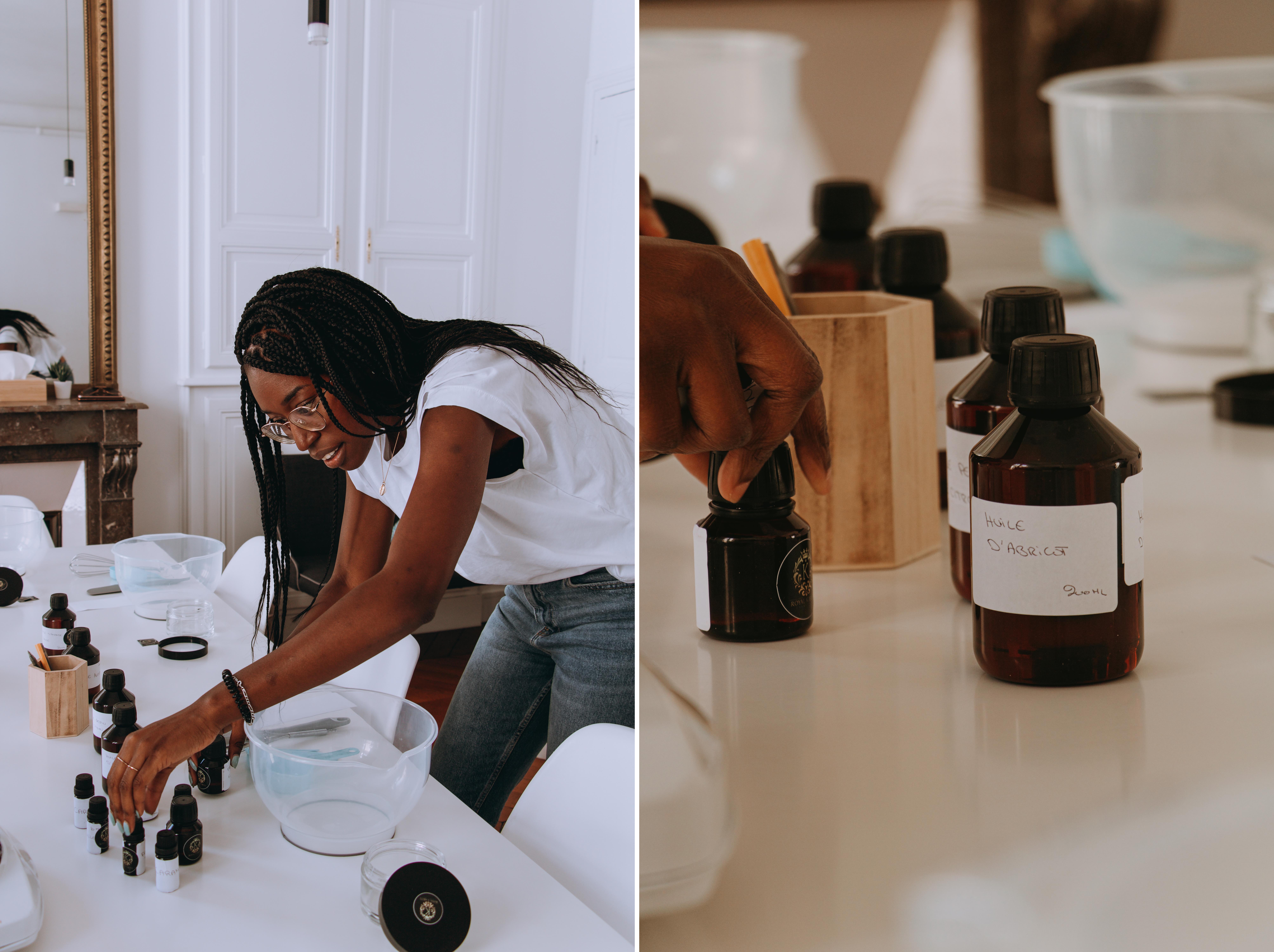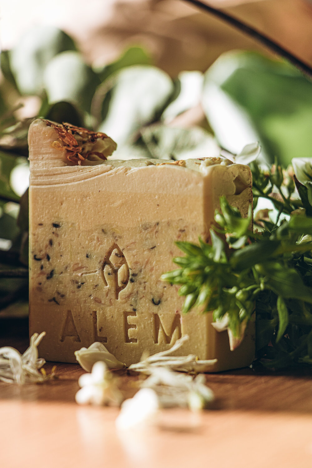 Pendant ce moment de convivialité, Alhem, artisane savonnière et fondatrice de la savonnerie Alem guide les participant·es pas à pas dans la réalisation d’un savon solide. Elle leur enseigne la technique ancestrale de la saponification à froid, le calcul des pourcentages d’huile et de soude, la confection d’un savon en fonction des besoins de la peau de chacun·e, le choix des ingrédients, et le coulage et la décoration du savon.
