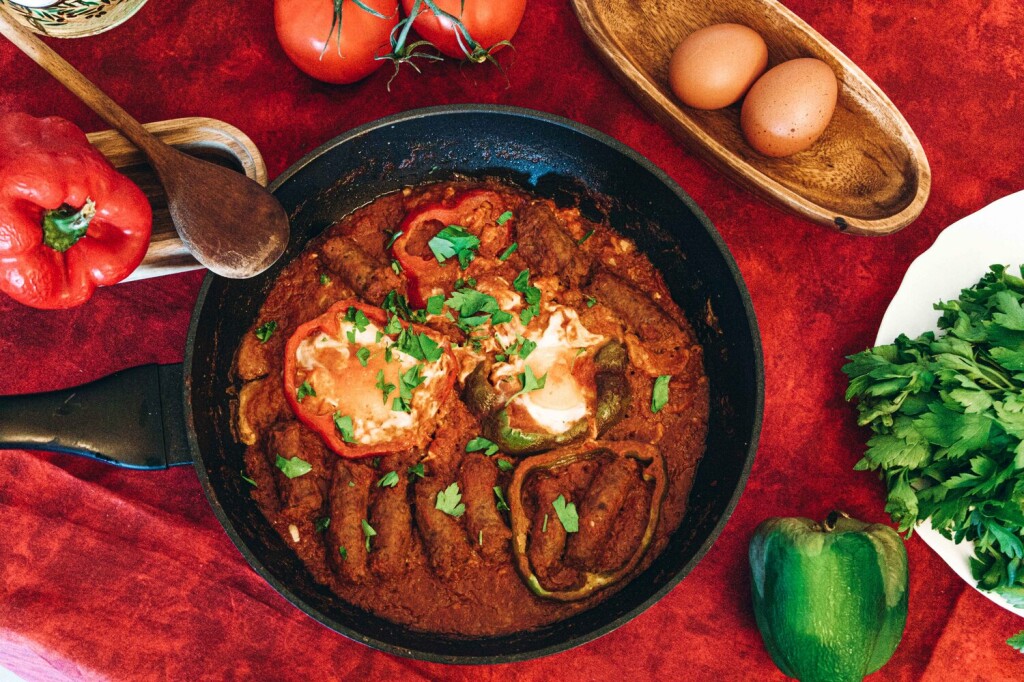 Au menu dans cet atelier : kefta au thon, ojja tunisienne végétarienne ou aux merguez halal, khobz (pain maison), et salade de fraises fraîches marinées à la menthe et à l’eau de fleur d’oranger.
