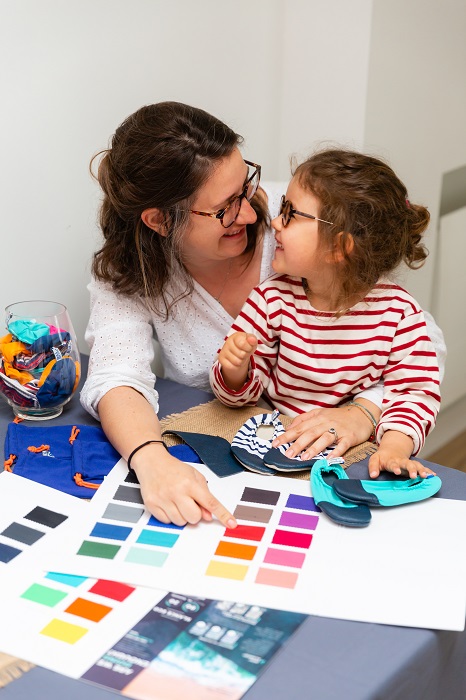 Elle pousse alors le challenge un cran plus loin en imaginant des chaussons à la fois pratiques et multi-usages. Elle apprend donc à dessiner des modèles multi-pointures qui dure longtemps et qui puissent aussi aller à l’extérieur (sable, piscine, mer, plage).