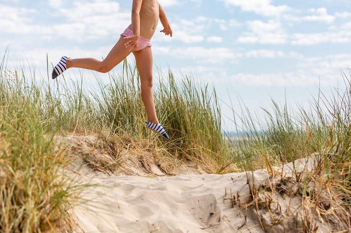 Alors comment leur éviter le risque de se blesser ou de se faire mal en glissant ? Comment les laisser profiter au maximum de leurs vacances, gambader sur le sable et mettre les pieds dans l’eau, sans se prendre la tête ? Comment les laisser descendre les escalier de chez mamie en toute sérénité ?