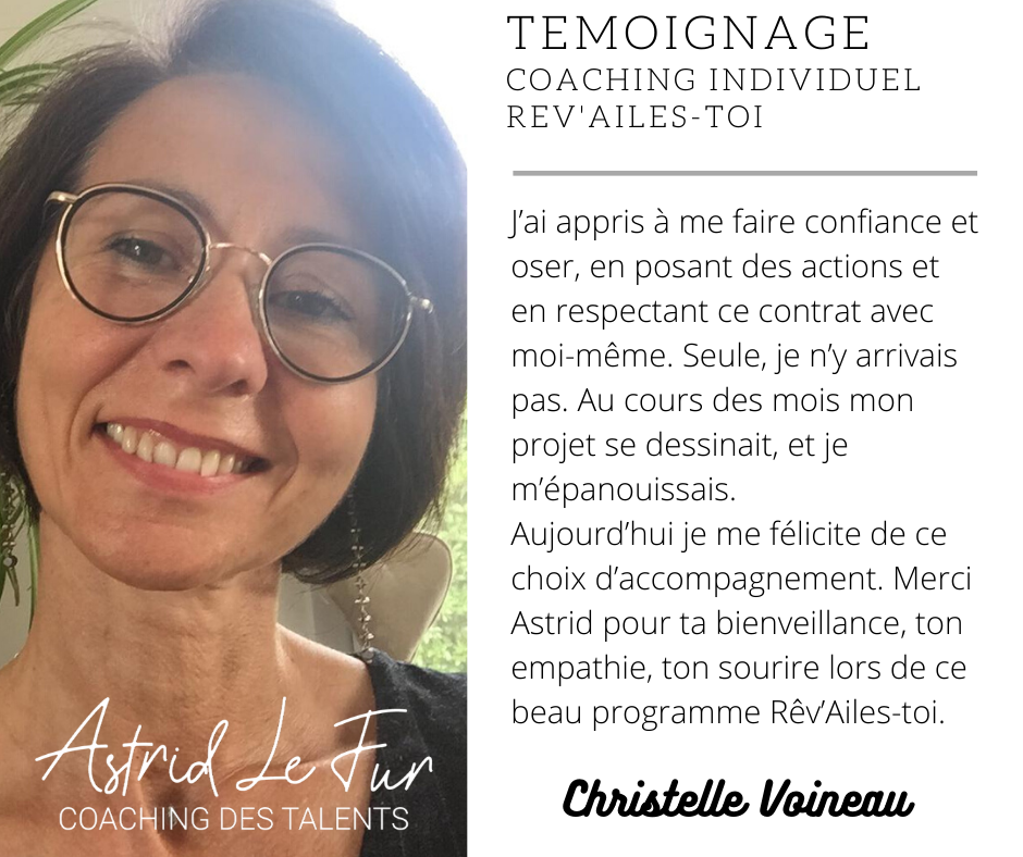 Ses premiers clients ayant tous un lien avec le burn out, Astrid comprend alors à quel point son vécu est un atout pour ses accompagnements. Elle ajoute à son parcours une formation à la prévention du burn out et à la médiation des conflits en entreprise et se spécialise officiellement dans ce domaine. Elle crée alors le programme Rêv’Ailes-Toi destiné aux personnes ayant vécu un épuisement professionnel.