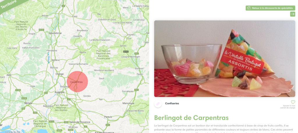Chaque spécialité est accompagnée d’un texte descriptif et d’une carte du territoire, qui permettent de mieux comprendre le produit et ses origines. Sur la page du produit figure également une liste des restaurateurs, producteurs et commerçants proposant la spécialité.
