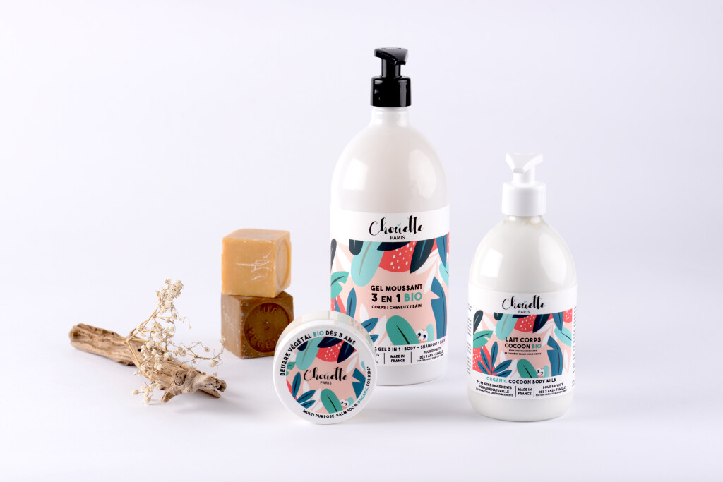 La gamme Chouette Paris, volontairement minimaliste, est composée d’un dentifrice, d’un gel moussant, d’un beurre végétal, d’un lait corporel et d’un savon. Les produits ont des formulations simples et saines, adaptées à toute la famille.