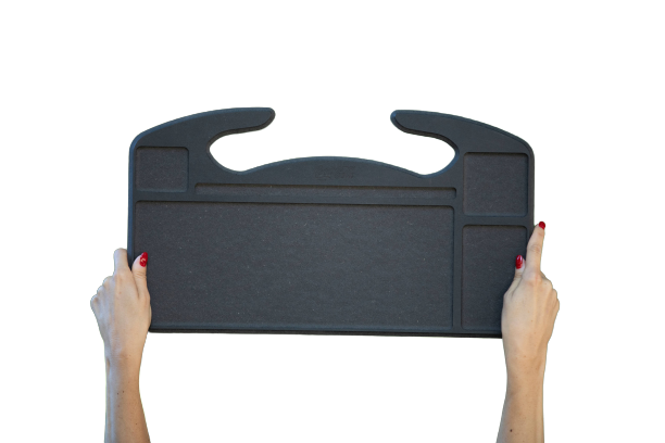 Ancienne commerciale, Caroline a très souvent travaillé avec l’ordinateur sur les genoux, dans une position inconfortable. Lors de cette crise sanitaire, en déjeunant dans sa voiture, elle renverse son taboulé libanais, persil et ail partout dans sa voiture ! Cette maman de deux enfants et entrepreneur, se dit qu’il faut absolument apporter du confort pour les itinérants et invente ce plateau pour volant.