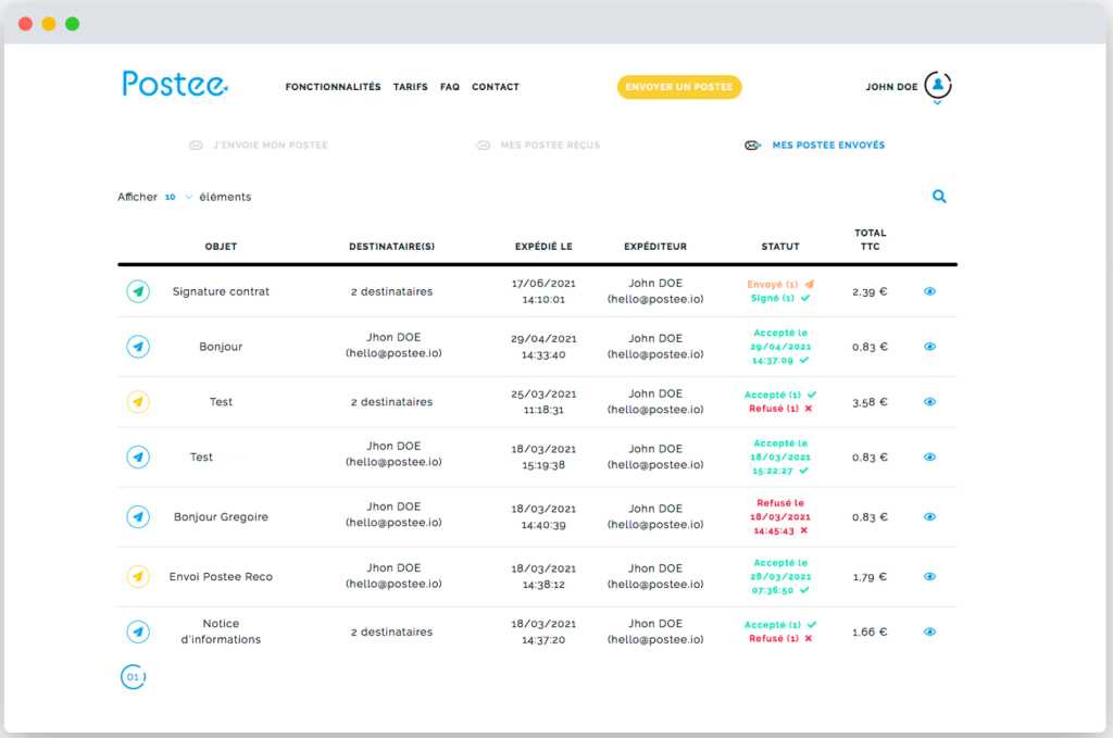 Postee est en effet une plateforme qui invente le courrier “nouvelle génération”, 100% digital : quelques clics suffisent pour expédier et gérer les courriers en ligne tout en bénéficiant d’une garantie juridique. Un service complet, abordable, simple et rapide pour passer en douceur à l’ère du 2.0.