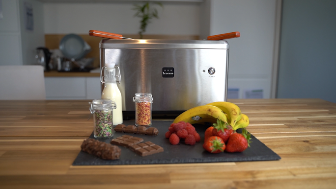 - Mettre sur la plaque supérieure de la crème liquide et des ingrédients au choix : chocolat, fruits, coulis, biscuits, pâtisseries, etc ;