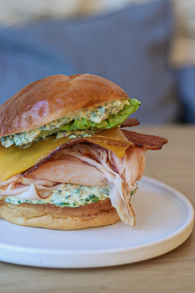 - Bun dinde & bacon : dinde fumée, bacon grillé, cheddar fondu, sucrine et sauce ravigote dans un burger bun ;