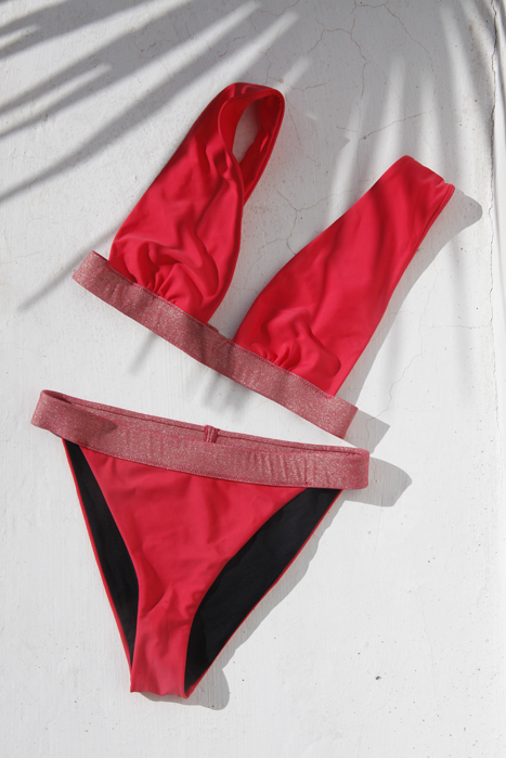 Ce deux-pièces bandeau est composé d’un haut doré avec liens à nouer autour du cou, ou à porter attachés sur la poitrine, et d’un bas qui joue les contrastes avec sa couleur cerise.