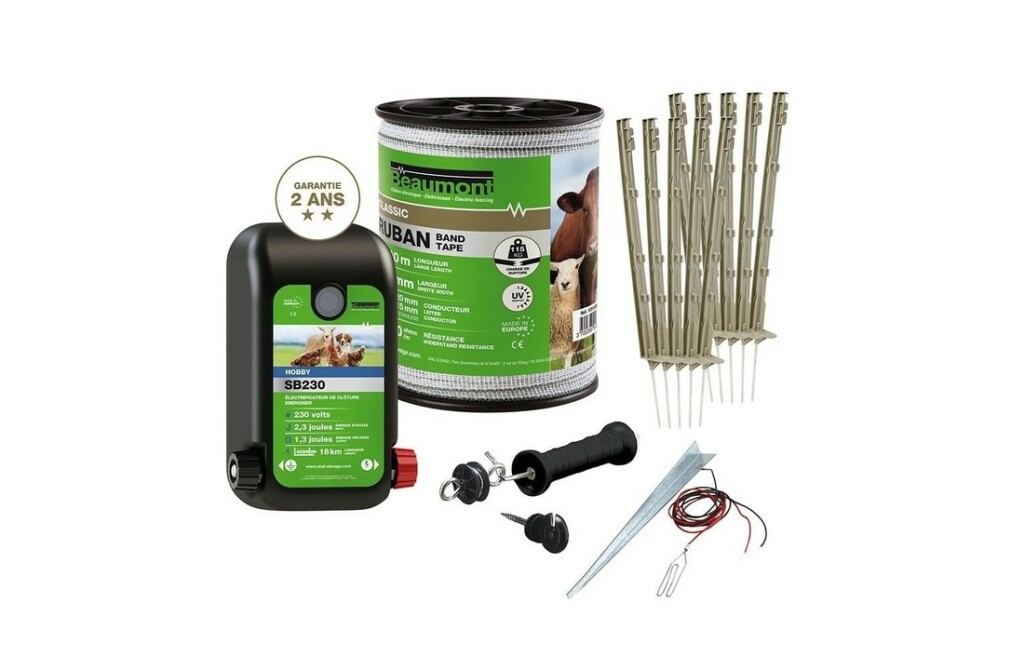 Ce kit de la marque Beaumont contient tout le nécessaire pour construire une clôture qui protège le potager des animaux domestiques et sauvages, mais aussi des voleurs. Il est composé d’un poste mixte que l’on peut brancher sous secteur, ou avec une batterie, de 2 rubans, de 10 piquets en plastique, d’un piquet de terre pour une meilleure isolation, de 8 isolateurs annulaires, de 5 rubans de raccord et de 2 kits de porte avec ancrage.