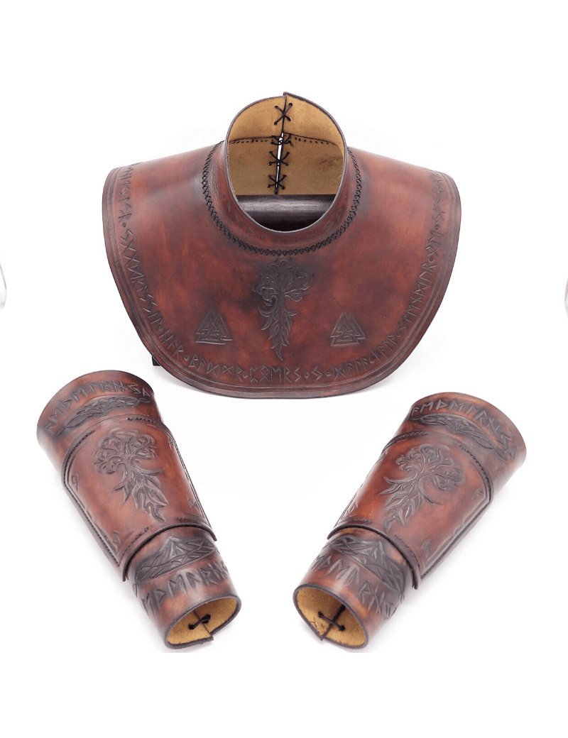 Composé d’un gorgerin et d’une paire de canon de bras représentant l’arbre de vie Yggdrasil, cet ensemble s’ajustera parfaitement grâce à son système de laçage. Les motifs repoussés, la teinture et toutes les coutures point sellier sont entièrement réalisés à la main.
