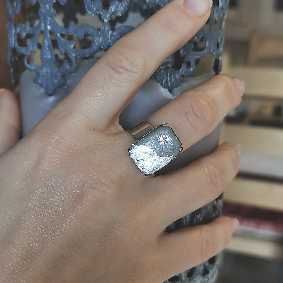 Cette bague est dotée d’un cabochon rectangulaire en béton, argenté à la feuille d’argent 999 et incrusté d’un cristal rond Swarovski.