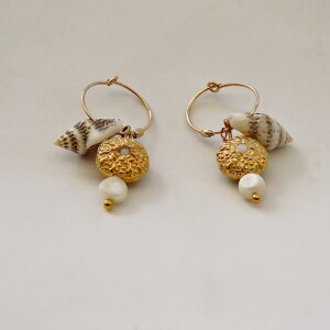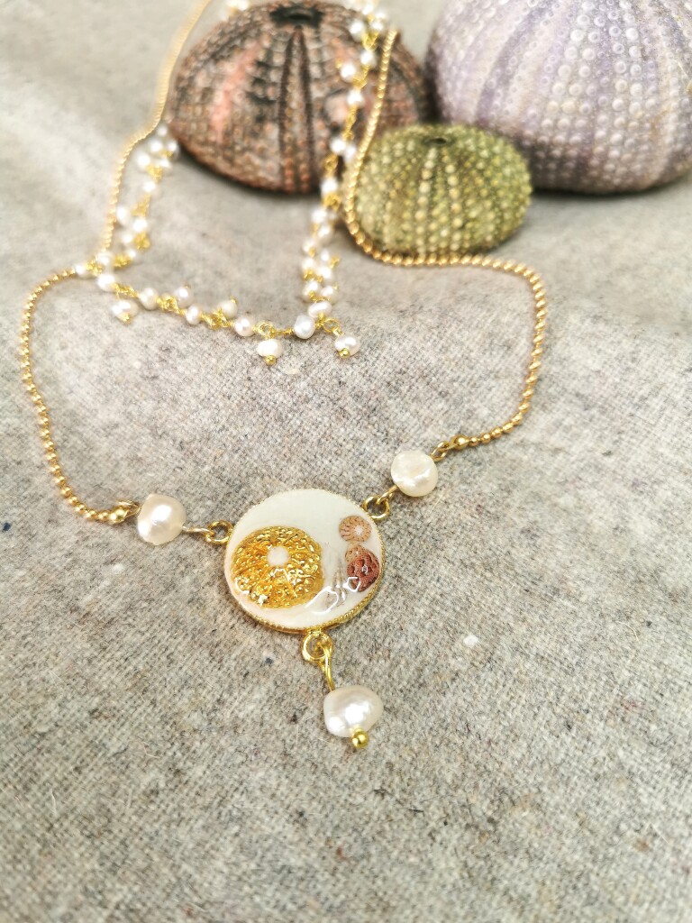 Le collier double rang est doté de deux chaînes : une chaîne en argent doré ponctuée de petites perles d’eau douce, et d’une chaîne à billes en gold filled. Au centre de cette chaîne se trouve un intercalaire doré, sur lequel un oursin et des mini-coquillages sont pris dans un ciment blanc.