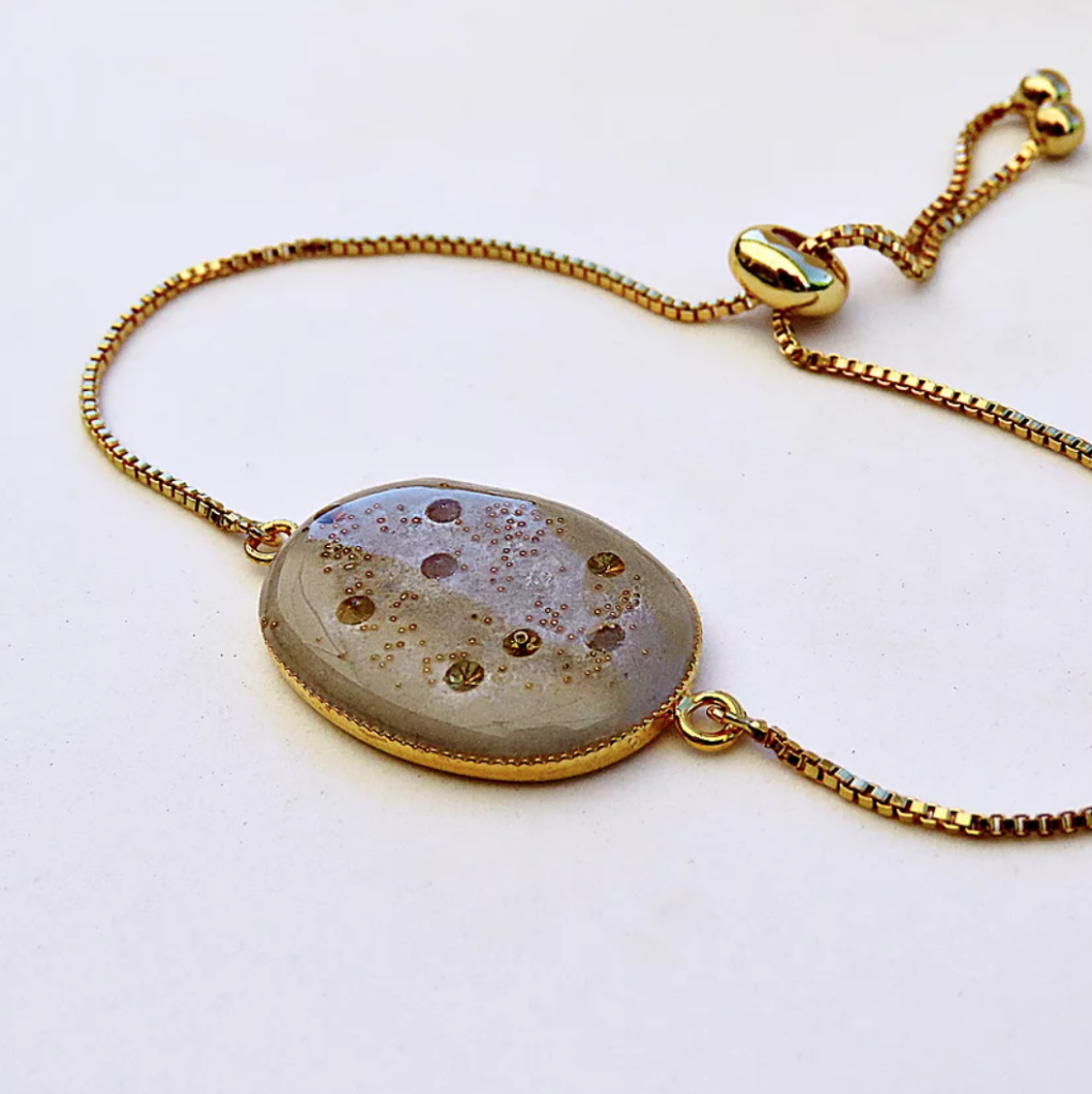 Fin et élégant, ce bracelet est composé d’une chaîne en maille vénitienne et d’un connecteur ovale en ciment résiné, cristaux et microbilles de verre dorées.