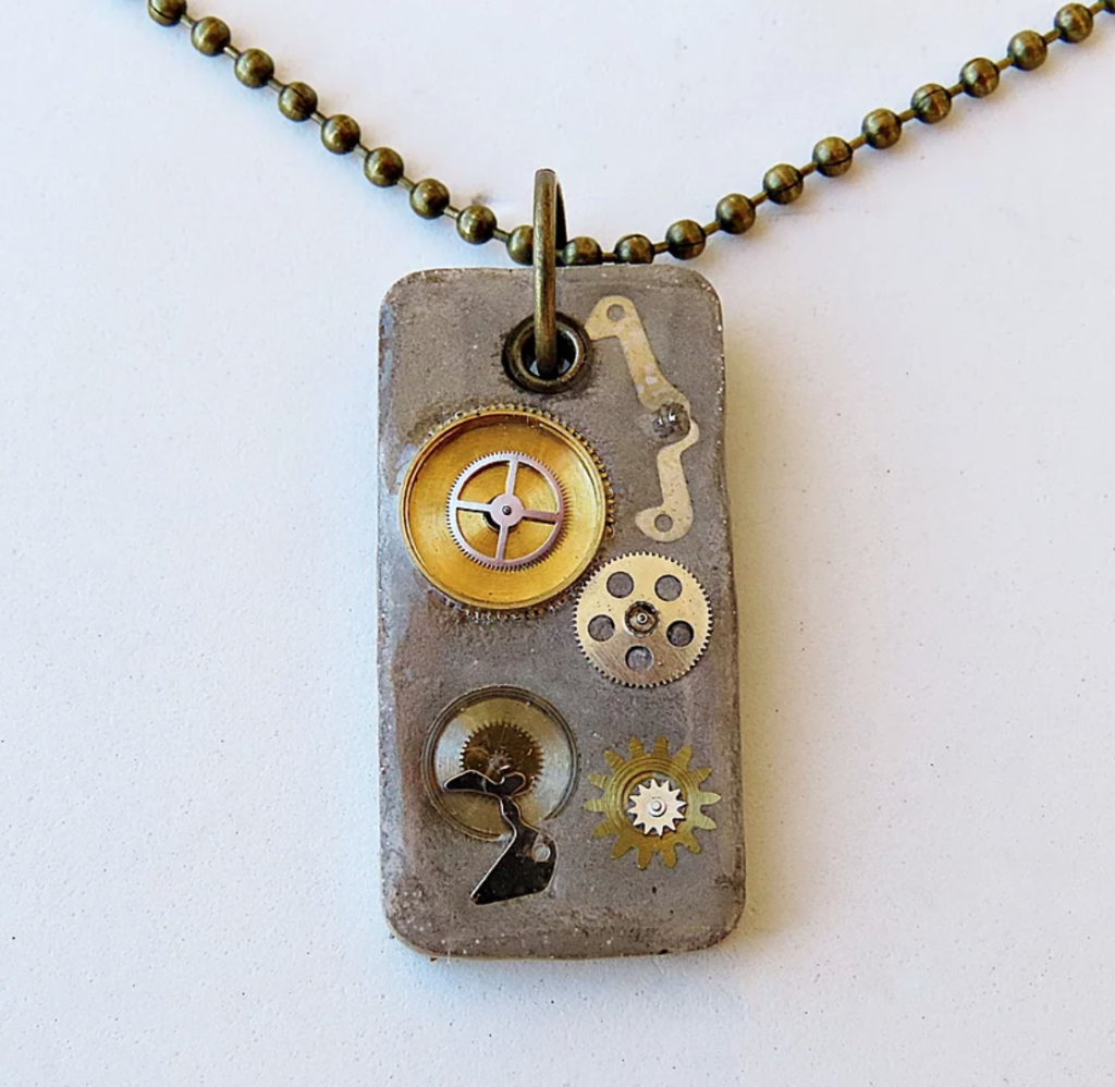 Avec ce collier issu de sa collection pour hommes, Laur’en Bijoux revisite la plaque militaire en puisant dans l’imaginaire steampunk. Des engrenages et rouages d’horlogerie sont incrustés dans le ciment, comme dans une tentative d’arrêter le temps.