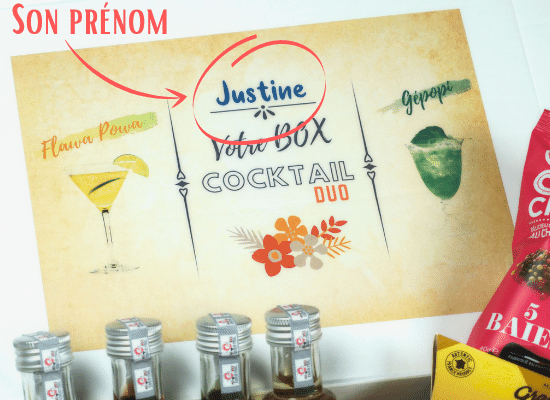 “Cette box était pour offrir, elle a fait son effet, l’attention avec le prénom de la personne sur la boite était sympa, mais surtout, le nécessaire pour faire un cocktail, des petits accompagnement gourmand et de la déco pour les verres. Je le referai et je conseillerai cette box. Merci !”