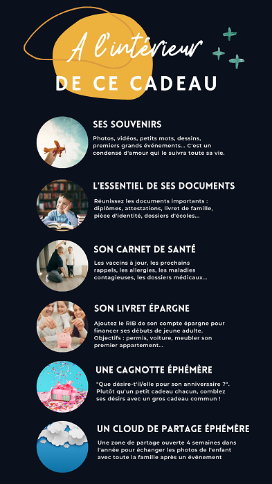 Ce coffre-fort numérique, alimenté par les parents et les proches, permet à chacun d’ajouter des photos, vidéos, messages dès la naissance afin qu’il les récupère à sa majorité.