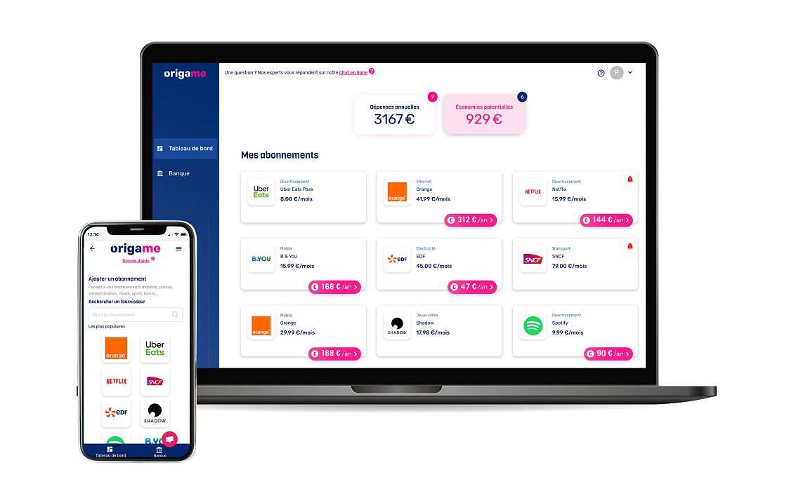 - Origame permet alors d’optimiser les abonnements trop coûteux ou résilier ses engagements obsolètes, en quelques clics.