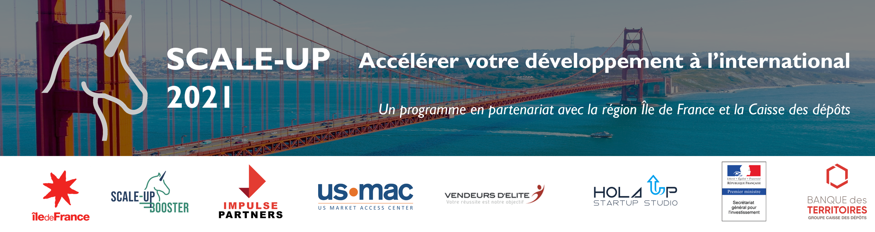 Scale-Up 2021 propose aux startups sélectionnées, après acceptation du dossier de candidature, un bootcamp et, pour celles dont le potentiel est le plus élevé, une mission d’accélération internationale en Silicon Valley.