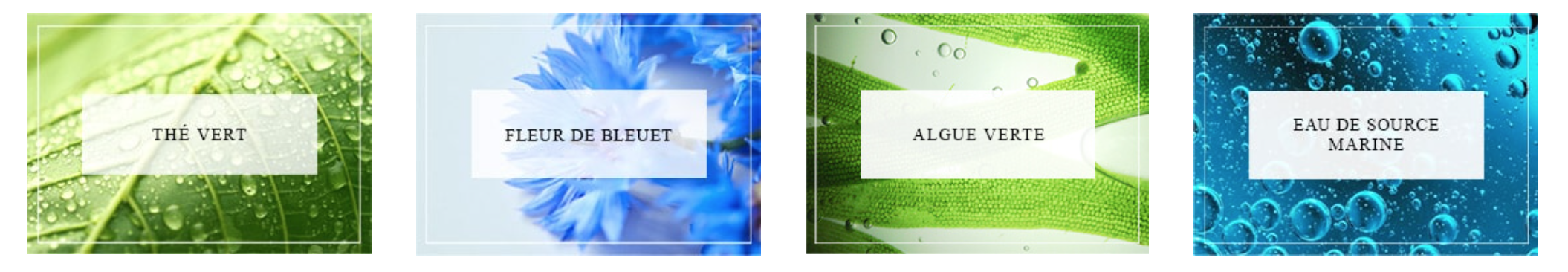 - Les Nettoyants, avec des extraits de thé vert, d’eau de source marine, d’algue boréale : Eau Micellaire, Lotion de Soin Hydratante, Gel Exfoliant et Mousse nettoyante.