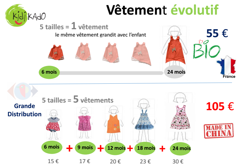 Aujourd’hui Kidikado est le seul fabricant à proposer des vêtements qui sont conçus pour être portés par l’enfant pendant une durée de 2 ans minimum. Vous disposez ainsi de 5 tailles différentes avec un seul vêtement évolutif.