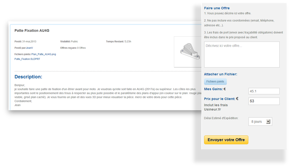 Les Usineurs, quant à eux, peuvent identifier les demandes qui correspondent à leur savoir-faire, aux matériaux qu’ils ont en stock, et à leur capacité d’outillage. Ils envoient ensuite gratuitement leurs offres d’usinage aux clients potentiels. L’inscription est gratuite et sans engagement.