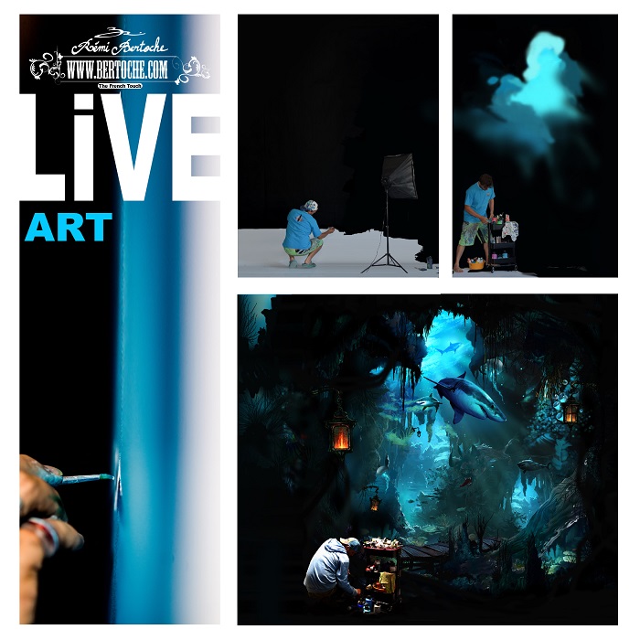 Ses performances de “live art” sont toujours spectaculaires : en direct, au cours d’une soirée ou d’un événement, il fait apparaître avec ses pinceaux l’œuvre dont rêvent ses clients.