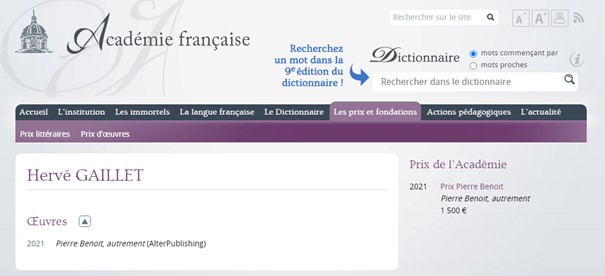 Nouvel auteur découvert et primo-édité par cette maison d’édition en 2015, Hervé Gaillet a ensuite été lauréat du Prix AlterPublishing en 2017 avant d’obtenir en 2021 ce Prix de l’Académie Française.