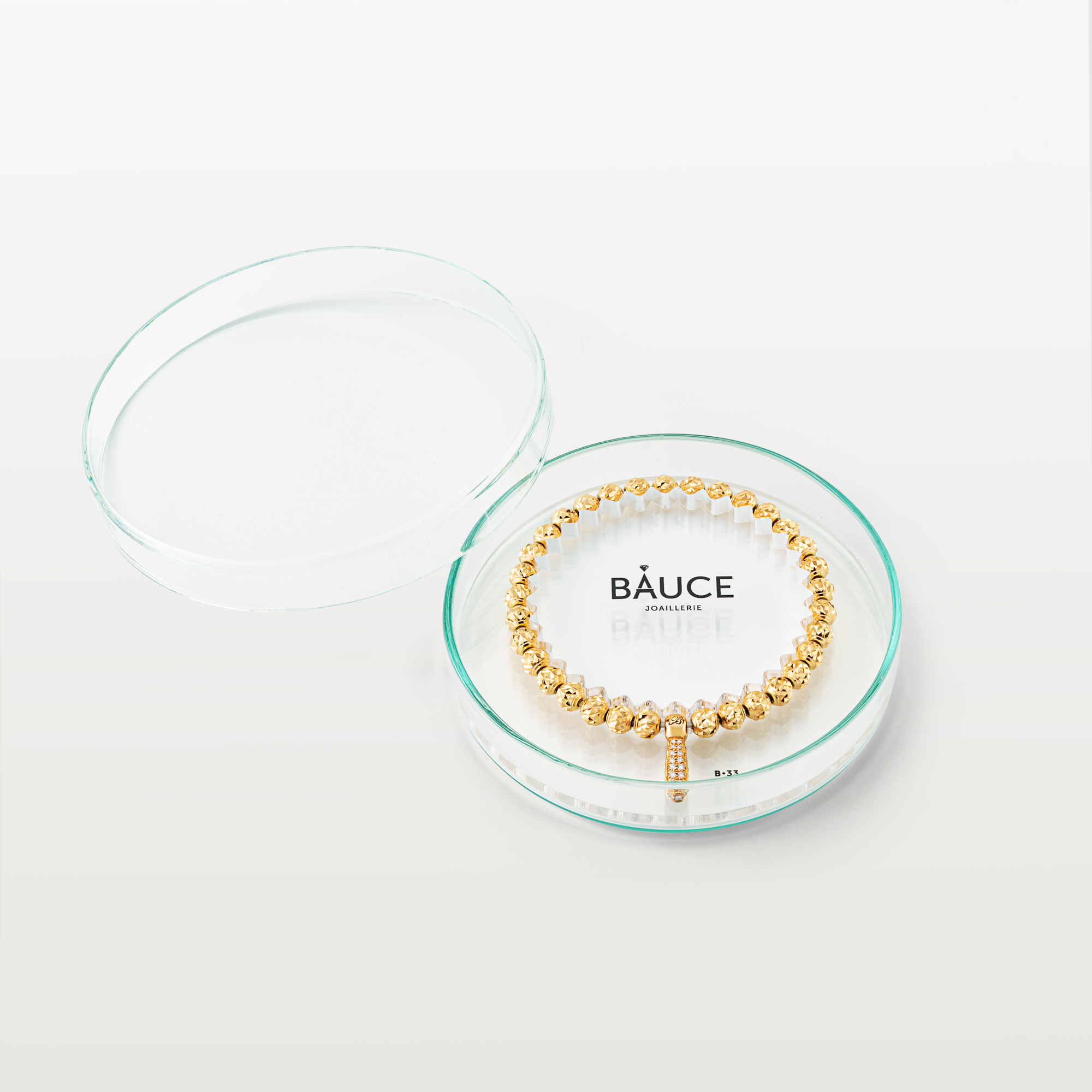 En 2015, trois ans après la fondation de la maison Bauce Joaillerie, Jamil et Bassier allient leurs savoir-faire et leur créativité pour élaborer un bracelet composé de 33 perles guillochées à la main et d’un intercalaire serti ou non de diamants. Cette première création devient le produit phare de la Maison Bauce.