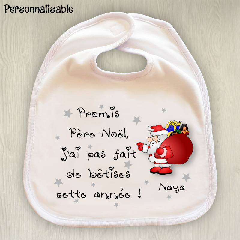 Grand bavoir pour bébé “Promis Père-Noël, j’ai pas fait de bêtises cette année !”, personnalisable avec le prénom de l’enfant, idéal pour faire un cadeau original et utile à Noël.