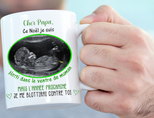 Mug Noël personnalisable avec une échographie, idéal pour faire un cadeau vraiment original au futur papa ou même pour lui annoncer la grossesse ! Possibilité de prendre l’option “mug magique” si l’on souhaite une tasse noire qui ne fait apparaître l’image que lorsqu’un liquide chaud est versé dedans.