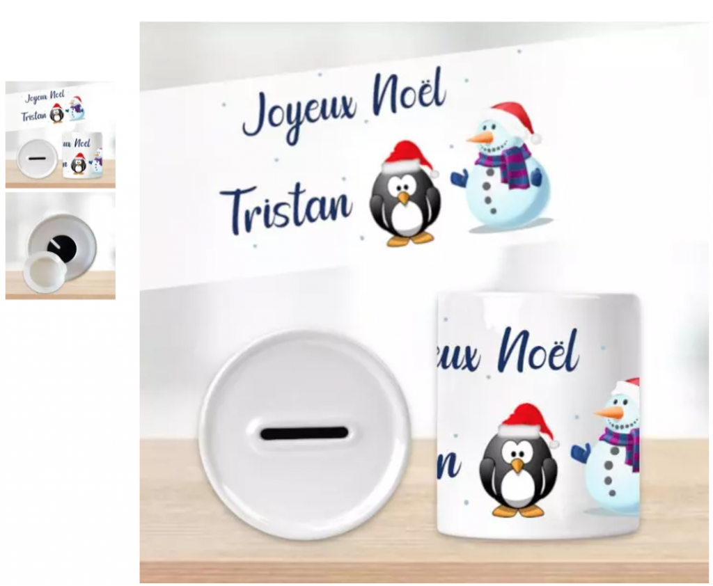 Tirelire en céramique personnalisable avec le prénom de l’enfant, pour un cadeau qui amène à faire des économies. Modèle bonhomme de neige et pingouin : couleur Blanche, fente sur le dessus pour glisser les pièces et les billets (pliés), fermeture en caoutchouc en dessous