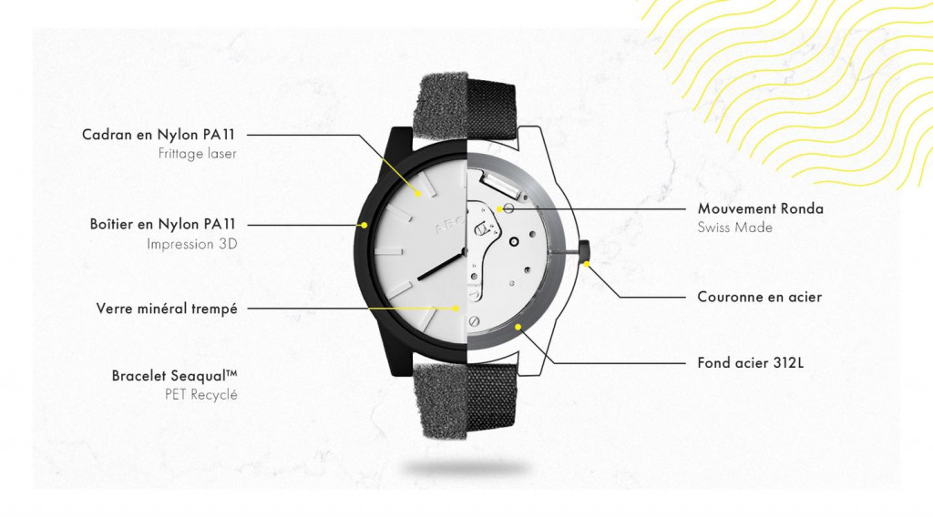 Deux types de bracelets sont proposés : un bracelet en tissu Seaqual en PET recueilli dans les océans et un bracelet en matériau issue de la fibre de bois.