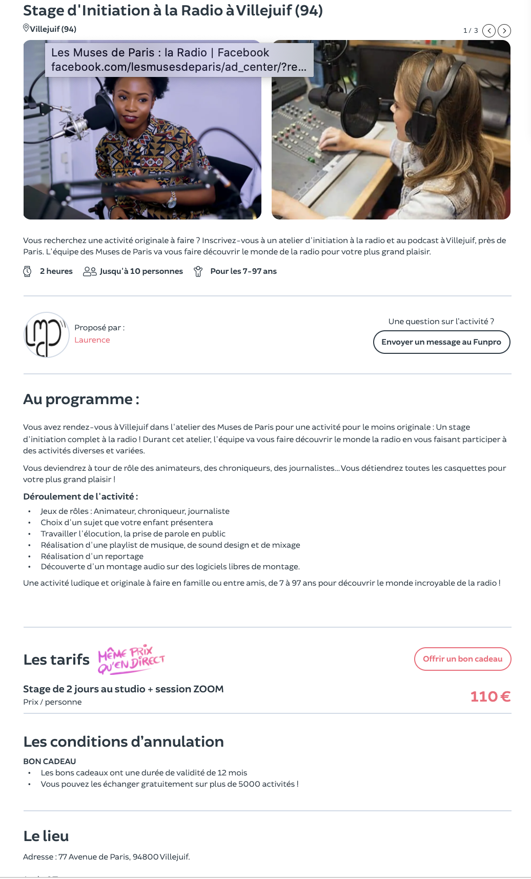 • L’atelier radio. L’atelier radio est un team building original, créatif et impactant qui permet de passer une journée ou plusieurs journées dans un cadre étonnant, tout en fédérant les participants autour de valeurs et de thèmes qui les touchent. Il peut être offert par un particulier à sa famille, par une entreprise à ses partenaires, clients ou salariés, ou par une école à ses élèves.