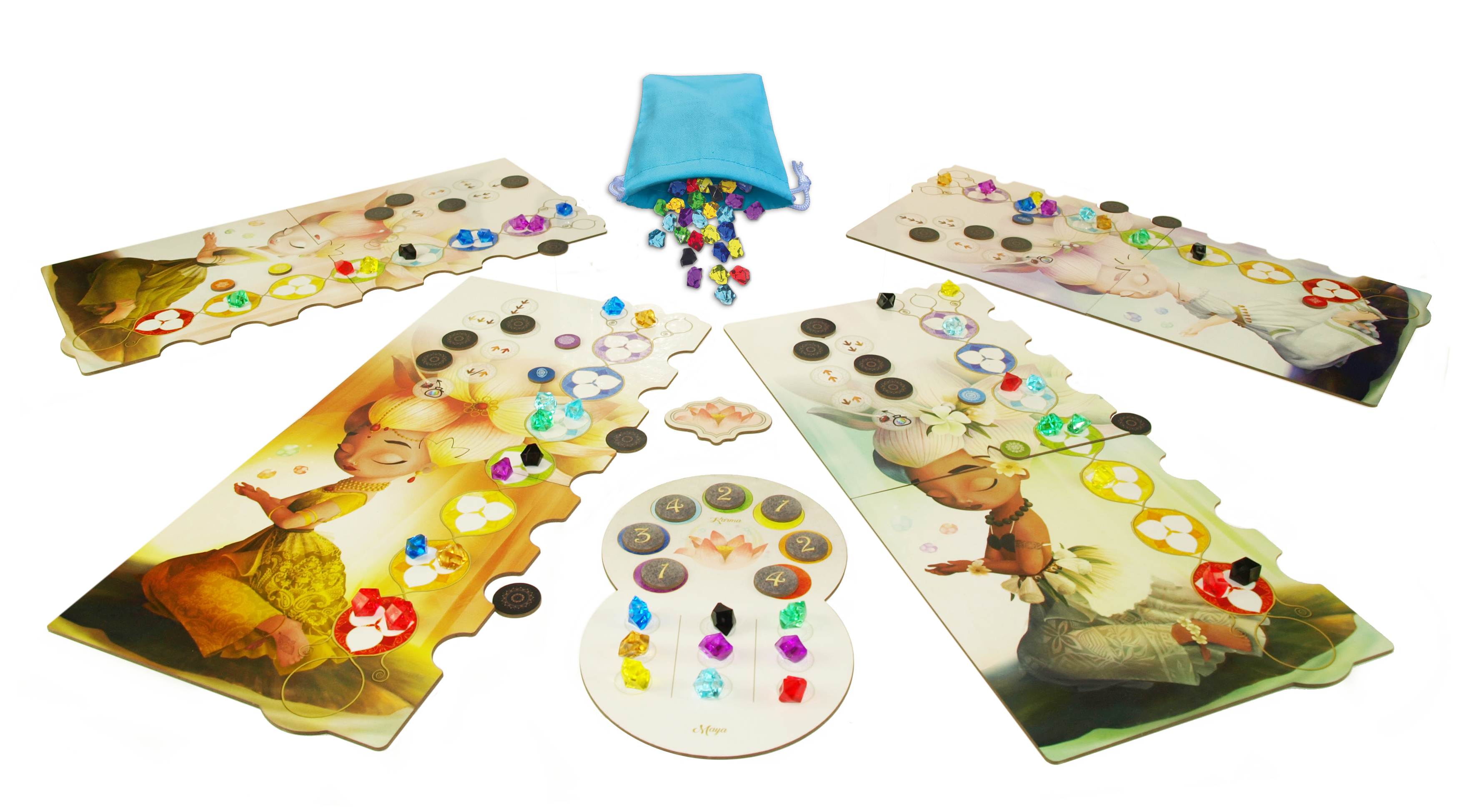 Les participants doivent récupérer des gemmes et les faire circuler sur leur plateau afin d’aligner leurs chakras, sans se laisser perturber par les énergies négatives. Avec ses illustrations pastel pleines de charme, ce jeu favorise les interactions douces et la réflexion.