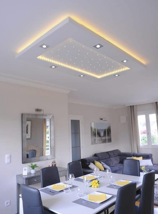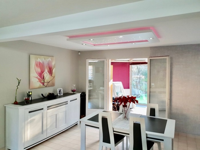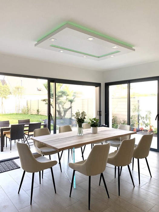 Les plafonniers Luminnov sont en effet tous composés de 4 à 6 spots LED multicolores, d’un ciel étoilé et d’un liseré lumineux d’ambiance variable, d’un puissant rétroéclairage variable également de toutes couleurs et de toutes nuances de blancs (vif, lumière du jour, chaud et intermédiaires) permettant d’obtenir une luminosité inégalée dans les pièces y compris au plafond et sur les murs. Pour une soirée chaleureuse et réconfortante, ils offrent la possibilité étonnante de pouvoir personnaliser à souhait la couleur de ses murs en 2 secondes avec la décoration interne de son intérieur (nappes, serviettes, fleurs, coussins, objets… ) !