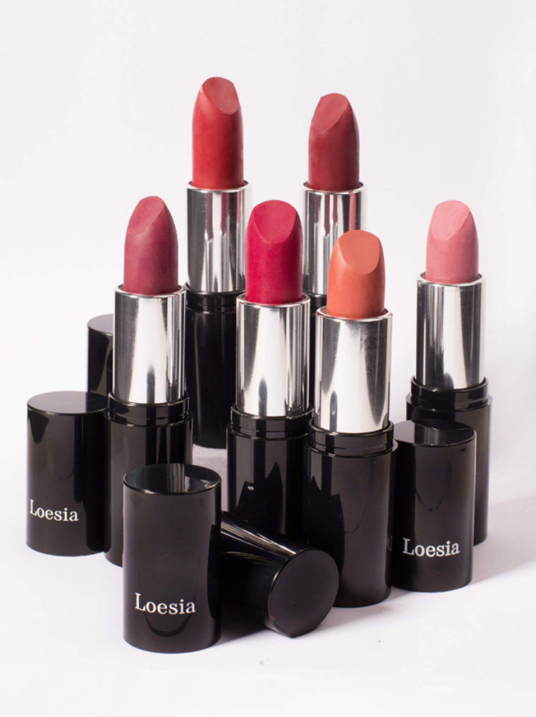 Les rouges à lèvres Loesia se déclinent en sept teintes universelles qui s’adaptent à toutes les peaux, et offrent un rendu satiné unique en fonction de la carnation de chacune.