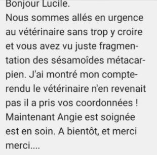 “Bonjour, je voulais vous remercier pour Hope et Aton. Aujourd’hui je suis allée comme d’habitude et Hope est venue vers moi toute paisible. Elle s’est laissée caresser ; avant elle acceptait deux minutes mais là elle est restée un petit moment. (…).”