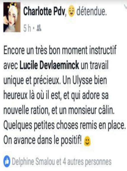 “Lucile Devlaeminck suit mon cheval et fait des merveilles sur lui. Mon loulou est assez “exigeant”, il ne se laisse pas soigner par tout le monde et il a tout de suite adopté Lucile !”