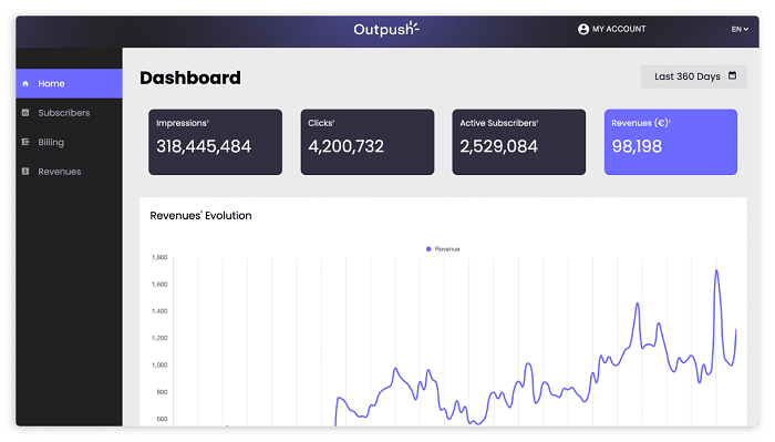 OutPush permet d’avoir une couverture publicitaire mondiale pour générer un maximum de revenus. Il est possible de suivre ses gains au quotidien via le dashboard. Le paiement est ensuite effectué chaque mois via PayPal, Payoneer ou virement bancaire.