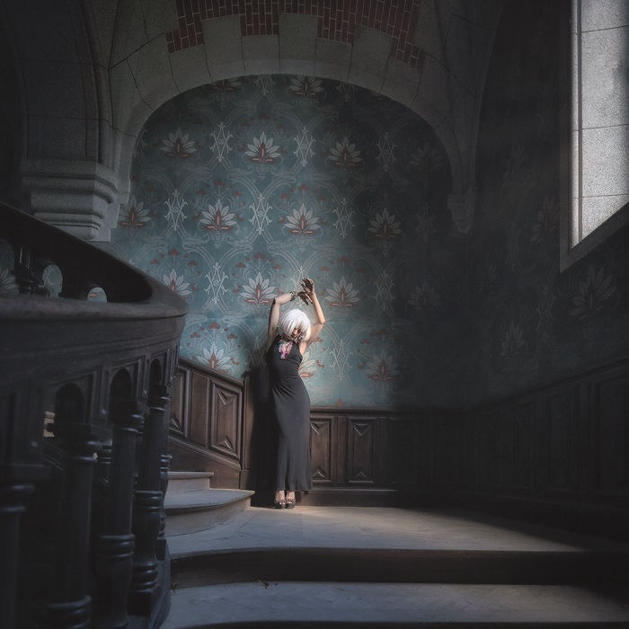 Umbertha réalise des autoportraits dans des lieux abandonnés à l’aide d’un déclencheur, toujours en lumière naturelle.