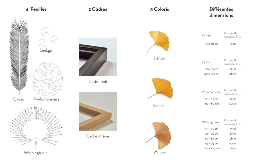 Pour cette collection, quatre modèles de feuilles tropicales sont proposés : Cycas, Ginkgo, Phylomonstera et Washingtonia. Ensuite, il faudra faire le choix du cadre : noir ou chêne.