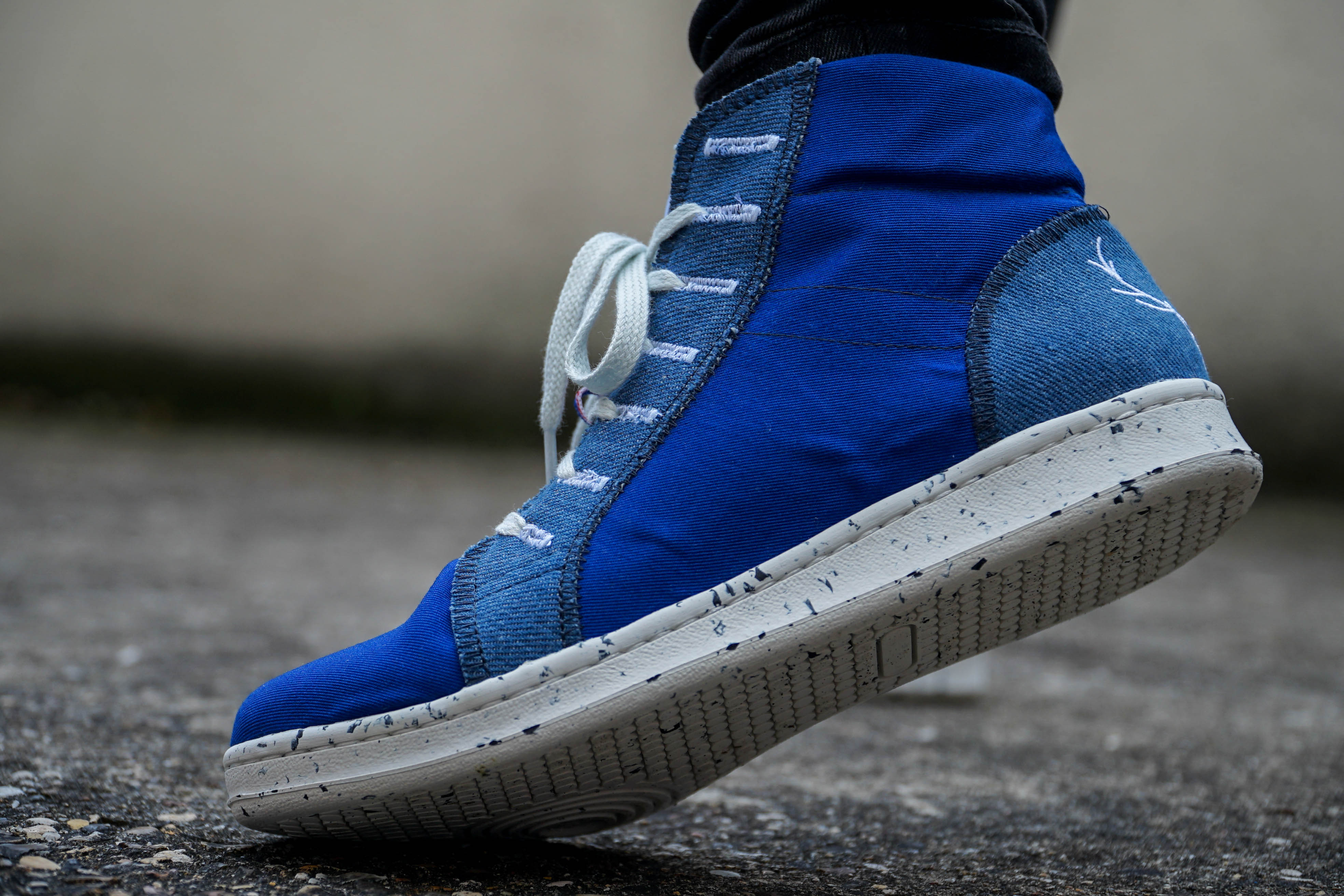 Les centres de tri débordent de vêtements et de matières de mauvaise qualité, dont la majeure partie est envoyée à l’étranger et finit généralement dans des décharges. Partant de ce constat, la volonté de la marque Caruus est toujours la même : fabriquer localement des produits qui durent dans le temps avec des matières responsables, mais en utilisant cette fois-ci de la matière qui a déjà eu une vie et qui est à disposition. Gisèle est donc une basket fabriquée en France entièrement à partir de matières upcyclées en centre de tri : des jeans et des bleus de travail.