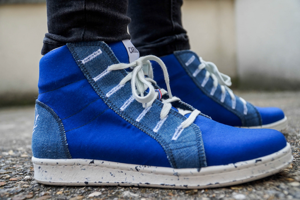 Gisèle s’inscrit ainsi dans la même ligne que les baskets précédentes, 100% recyclables. Avec toutefois une nouveauté : c’est la première basket upcyclée à partir de jeans, de bleus de travail et de draps. Le groupe travaille en exclusivité avec des entreprises françaises pour favoriser l’industrie du pays en créant des emplois et pour diminuer le bilan carbone de la fabrication. Caruus récupère la matière brute en centre de tri en Normandie, puis l’envoie dans son atelier à Romans-sur-Isère afin de réaliser la fabrication.
