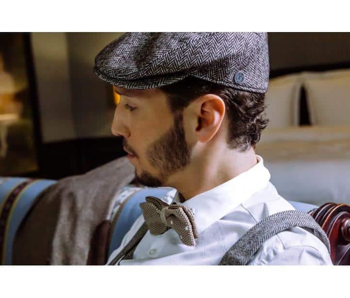 La ceinture de smoking Meatpacking accompagne le nœud papillon Arnold. Tous deux sont faits de soie satinée et sont fabriqués en Italie, sur les rives du Lac de Côme. Ils se déclinent en quatre motifs : tartan, pied-de-poule, prince de Galles et chevrons. Les chaussons de smoking Don, en velours noir brodé d’un braque Weimar, complètent la tenue.
