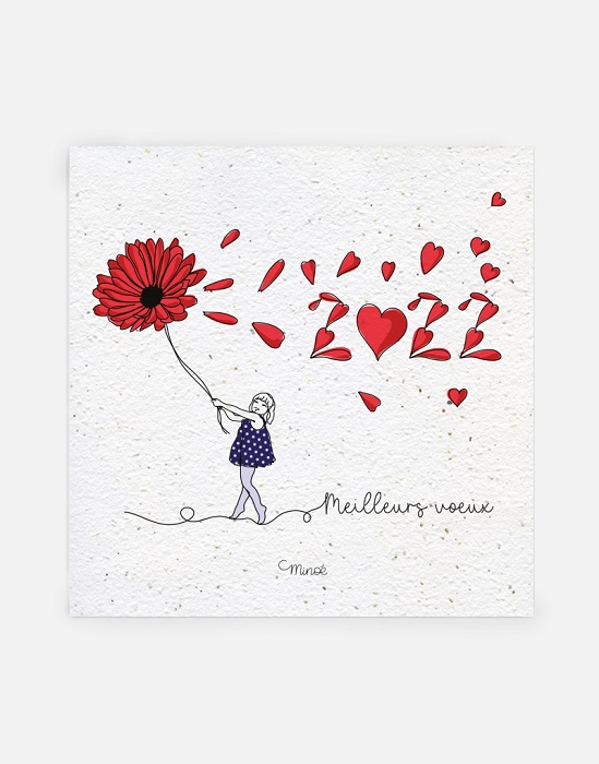 - 2020 : la carte pop up avec une fleur réalisée en papier ensemencée qui se déploie ensuite en une “vraie” fleur en 3D ;