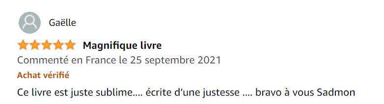 Authentique, combative, sans artifice, Sadmon écrit tout ce qui ne se dit pas. Les peines, les peurs, la culpabilité, la colère face à l’injustice… mais aussi l’Amour inconditionnel, celui qu’elle porte à ses enfants et qui l’aide à se dépasser.