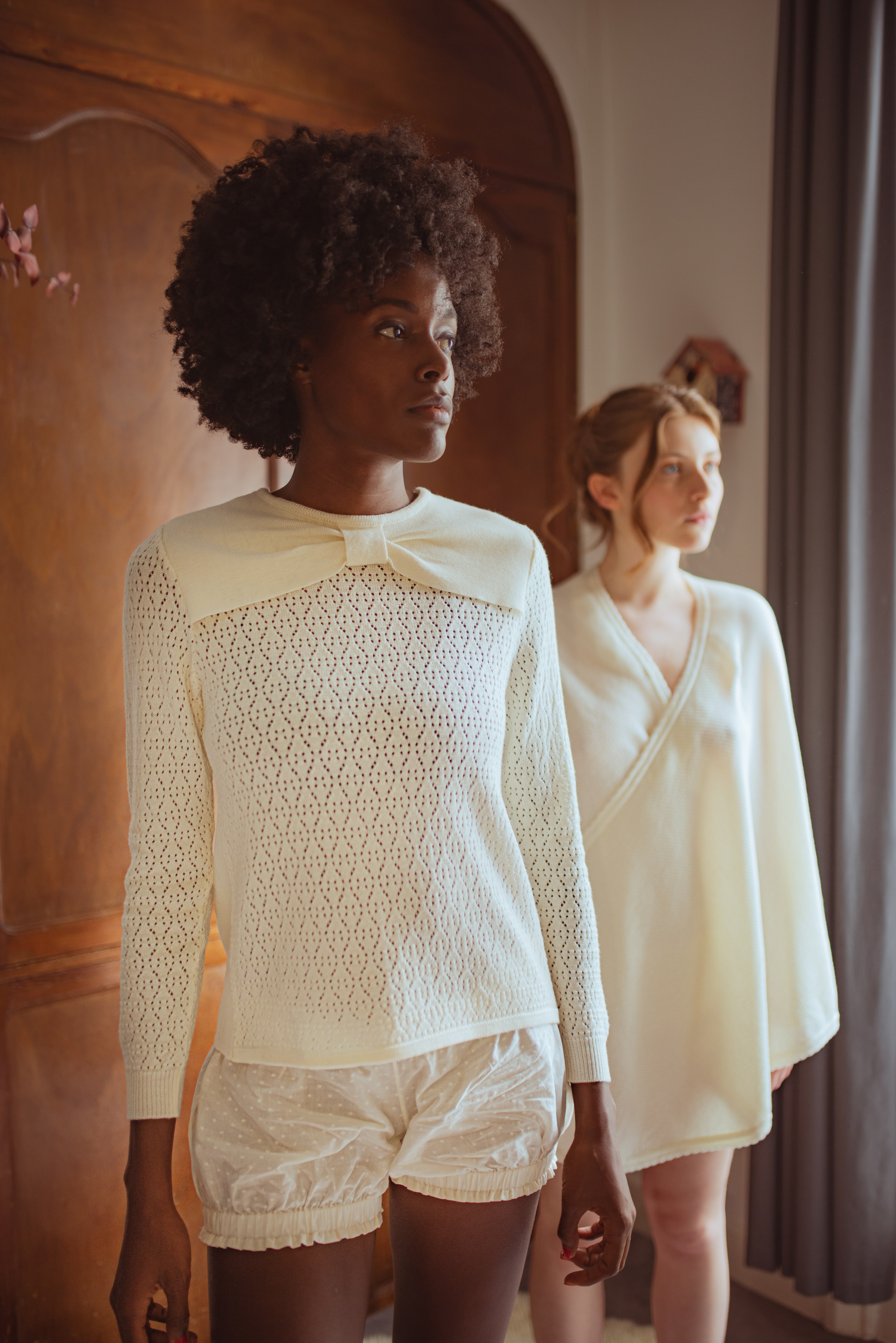 Après ses robes, nuisettes, déshabillés, bloomers et pyjamas, 71bis lance aujourd’hui une nouveauté : deux jolies pièces en maille mérinos, qui adoucissent et subliment l’hiver.